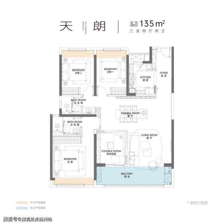 建面约135平边户,三房两厅两卫布局。