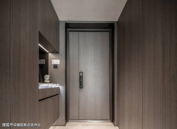 入户门选用重达约400斤,厚度约10cm 的重奢铸铝工艺门扇,经百余次打磨,形成独特的纹理质感,配以线条简洁的飞利浦入户门锁,让门变成“艺术品”。