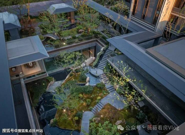 再往里走就是近460㎡的下沉式庭院,精选太行山金景石堆叠成小山丘,引进溪水汇聚成池塘,并移栽岭南珍贵的古桩铁冬青和中华原生乌桕树,形成一幅立体山水画卷。