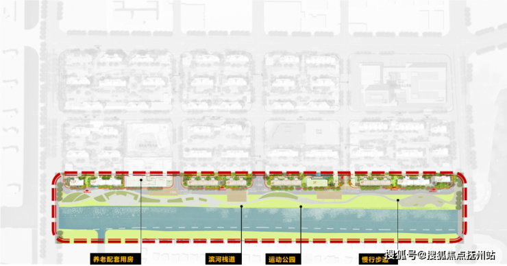 一界面是滨水景观界面(项目红线外),依托南侧的天然水系及滨水公园,打造慢行景观系统,并将滨河栈道、运动公园、骑行等多种功能嵌入,提升舒适度的同时,也为居民提供放松身心的好去处。