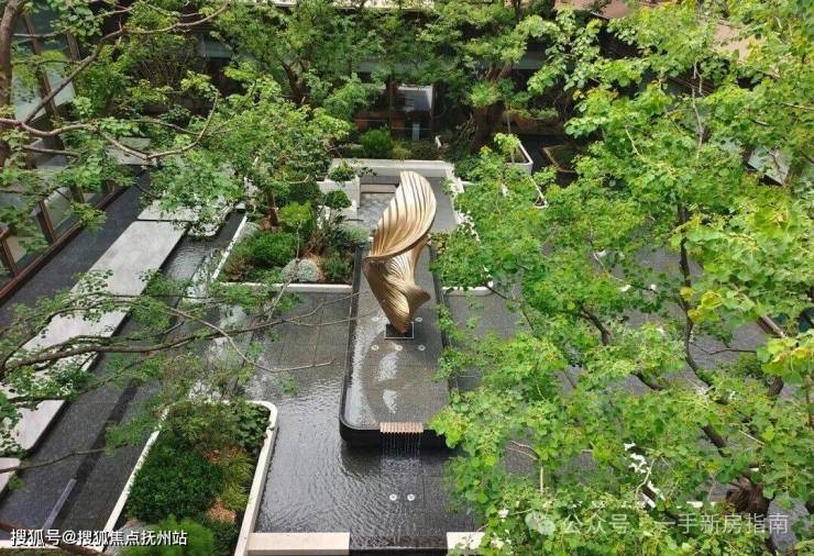 下沉式庭院以水景为底色,再配以特色树种、艺术雕塑、水间步道等,极为惊艳。