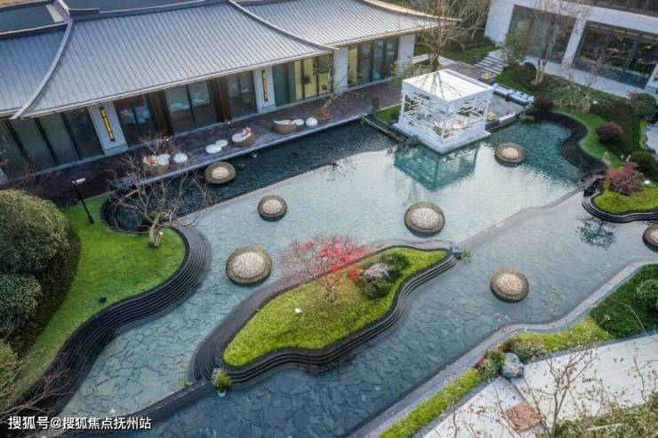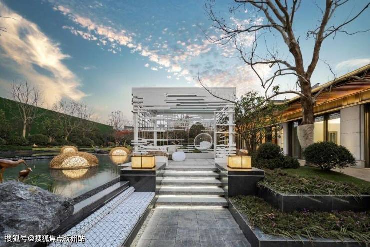 置身后院,山水绿植打造一派禅意空间,拱桥水景讲述着小桥流水人家的江南韵事。现代化的建筑搭建一片闲适的空间,邀邻里于此对弈,品茶赏景,往来交谈之间,感受生活的真意与自然的清新。
