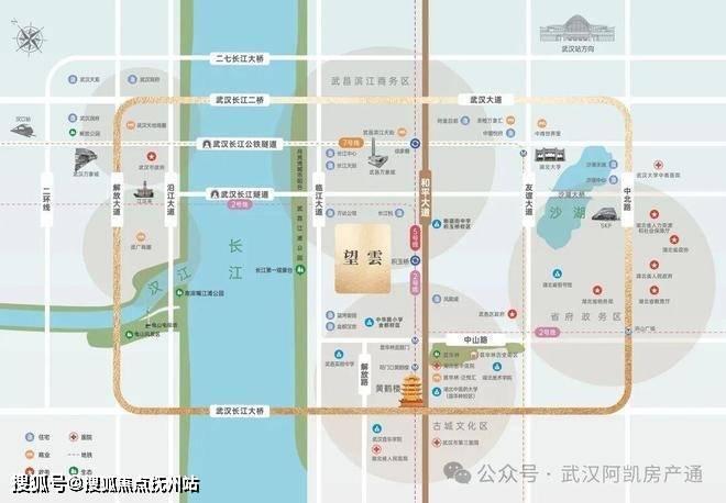 二轨二桥二隧:双地铁上盖,无缝衔接积玉桥站2号线、5号线;依托长江大桥、长江二桥以及长江隧道和武汉公铁隧道,快速纵横全城。
