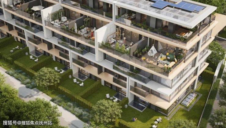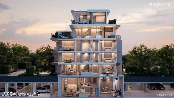 将建筑⼯艺与光影美学相融,阳台屋檐采用上扬式设计,打破传统平檐的视野遮挡,实现通透度、视野感与建筑格调的三重跃升;地下室采光井采用斜切面创新设计,打破垂直井道的光线桎梏,引导自然光更深更广地渗透入地下空间。