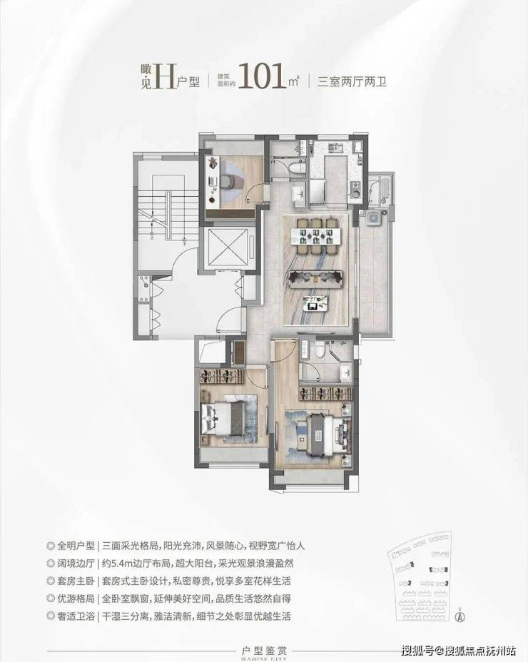H户型:瞰·见 建筑面积约101㎡,三房两厅两卫
