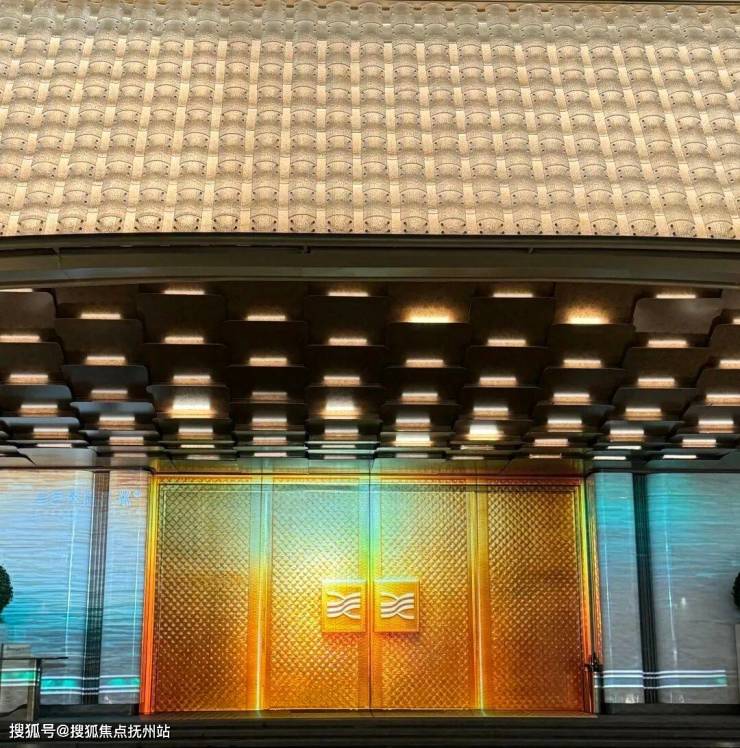 你看社区大门宽约46米,高约9米,灵感源自“京杭大运河博物馆”设计,顶部大约2280块水晶瓦精心雕琢,内部超300块金鳞铝板手工拼接,还有层叠水景,整个一看就贵气。