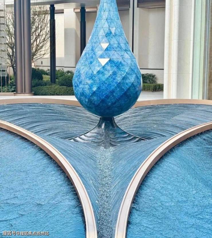 二进弧光织境,讲究“天圆地方”、“四水归堂”,中心水滴造型雕塑,形如宝瓶美轮美奂。