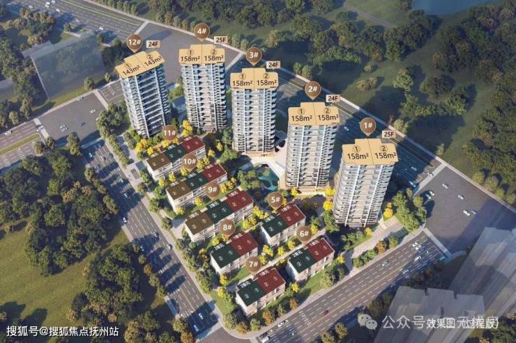 其中,1、2、3、4、12#为高层,1、4#为24F,其余均为25F,12#为143㎡户型,其余均为158㎡户型。