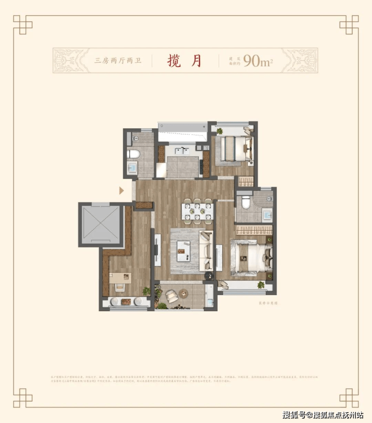 三个房间+二个卫生间配置,相比市面上90㎡2房或者3房1卫,功能性更强。