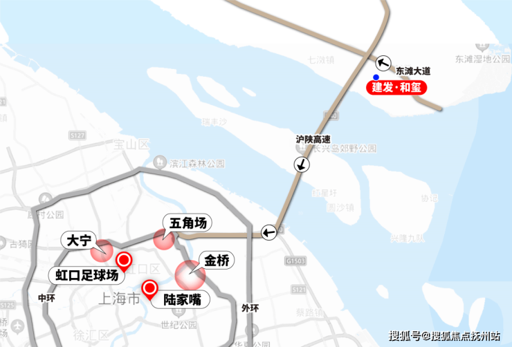 另外,从建发和玺出发到浦东金桥、杨浦五角场,通过长江隧道-绕城高速-五洲大道开车非常方便。