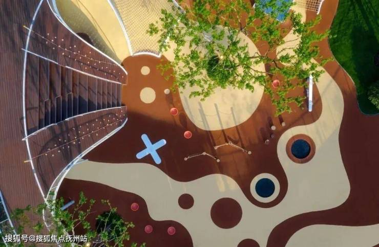 丛林中的运动乐园,运动健身器械散布在场地边。结合动感的艺术流线,设置儿童趣味活动装置。