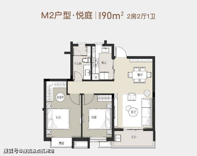 90平方米的2房2厅1卫户型图