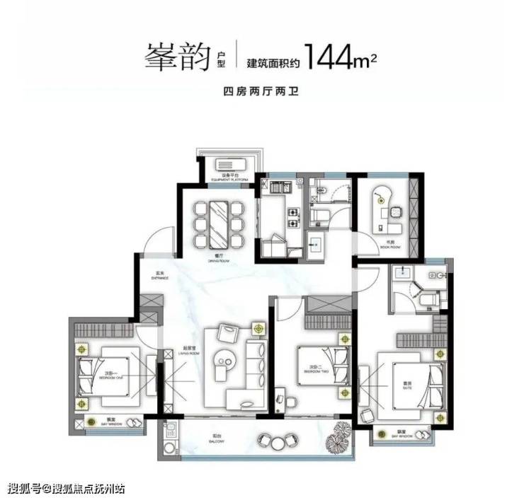 对尺度更有要求的改善家庭,也可以关注一下建面约144㎡户型,做到四开间朝南,入户就是开阔明媚的大客厅,连通着双开间大阳台,任由阳光洒落,尽瞰园林盎然,餐厅全明带窗户,靠近厨房,缩短做餐动线,朝南的房间,配备了全尺寸飘窗,主卧更带独立衣帽间和卫浴,私密性十足。