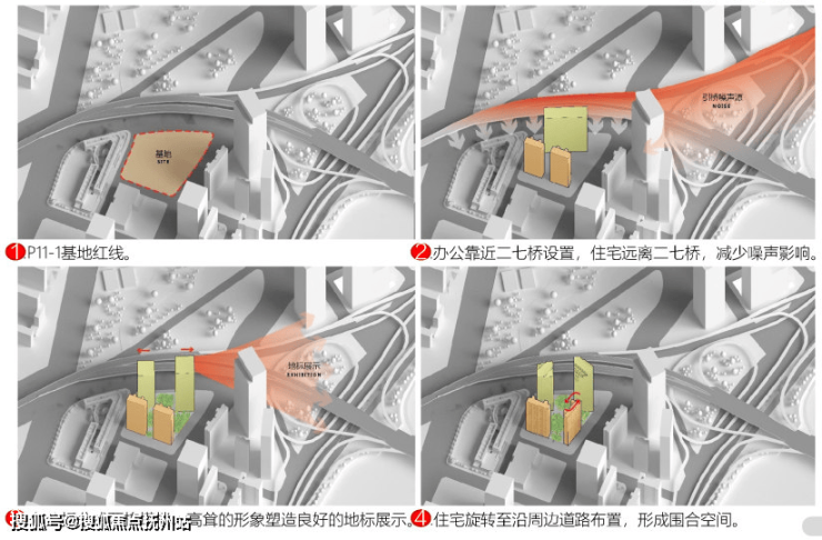 结合城市景观与周边建筑进行整体布局设计,围合式规划设计承袭老汉口城市肌理,十字视线通廊规划设计打造城市友好界面,通透的城市视线处理将场地中心绿化与东南城市景观带相衔接,并延至长江滨水景观带,塑造城市绿轴。