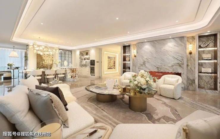 整个示范区里,运用了20余种奢石,如贝金米黄石材、蓝翡翠玉石、亚马逊绿奢石、广汉白石材、黄金丝绸大理石……奢宅的高级感,深入骨髓。