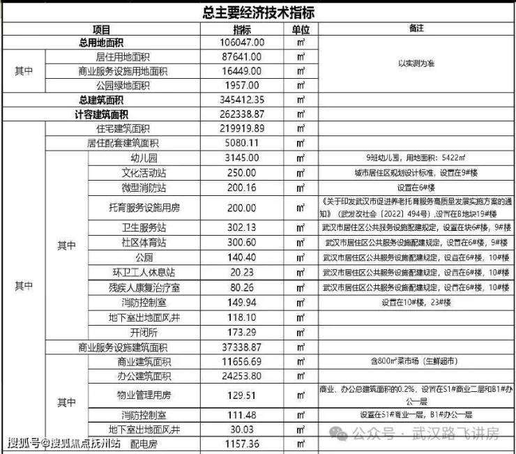 根据规划显示,项目总用地面积约10.6万方,居住用地面积约8.76万方,商服约1.6万方,公园绿地约1957m²。总建面约34.54万方,计容建面约26.23万方,住宅建面约21.99万方。