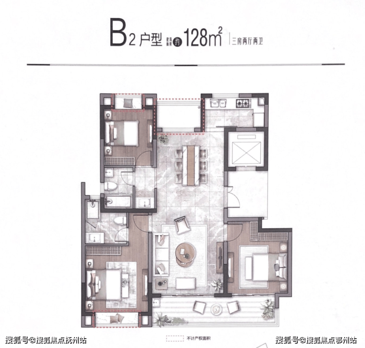 该户型南北通透,三开间朝南,阔绰景观双阳台,可以很好满足家人晾、晒、休闲的需求,双明卫设计既解决了家人早高峰期的洗漱问题,同时也避免了潮湿带来的细菌问题。