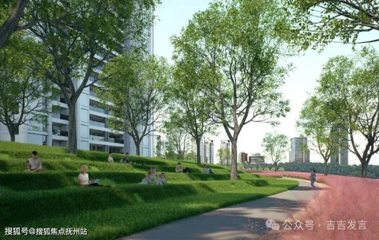 代建约2.8万方城市山丘公园:为社区健康底盘,以悬浮澍树、粉黛草原、山丘慢跑道及林下剧场等场景,为业主缔造城市山屿式慢游日常