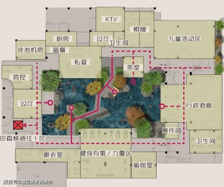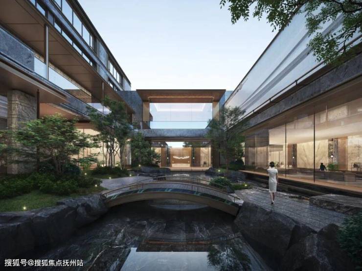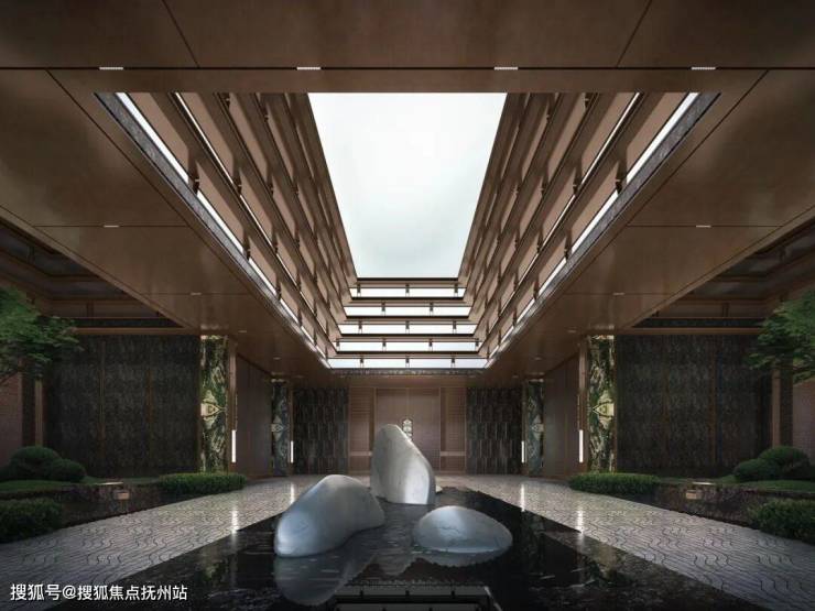 下沉式庭院:约1000方,复刻《溪山清远图》,从东侧“四水归堂”之门,经“十八学士”下沉庭院,景观设计层层递进,通过整面落地玻璃让下沉式景观和归家大门组合一整体,视觉冲击感强,悬挂户外泳池设计,地上地下互相成就景观视野。
