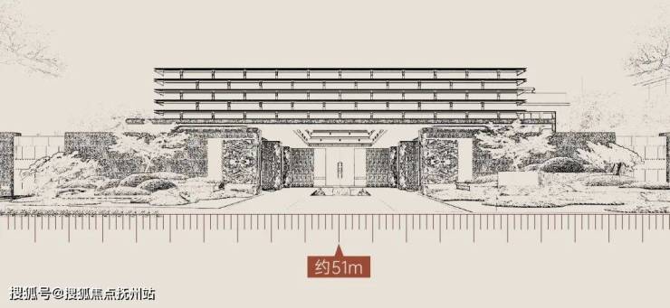 大门宽约50米、高约9.5米,形如“华盖”,取意“紫气东来、九五至尊”。