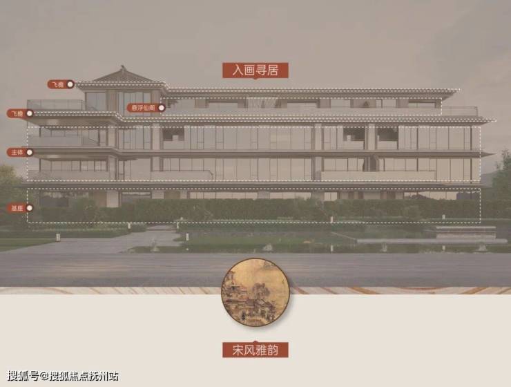 建筑立面从宋代《江山殿阁图》中汲取“高台仙阁”意象,以香槟金铝板的沉静对比美国白金火烧面的肌理,重塑现代东方的美学表达。设计团队以飞檐勾勒宋式轮廓,悬浮体块注入现代张力,构建兼具文化深度与时代感的居住标准。