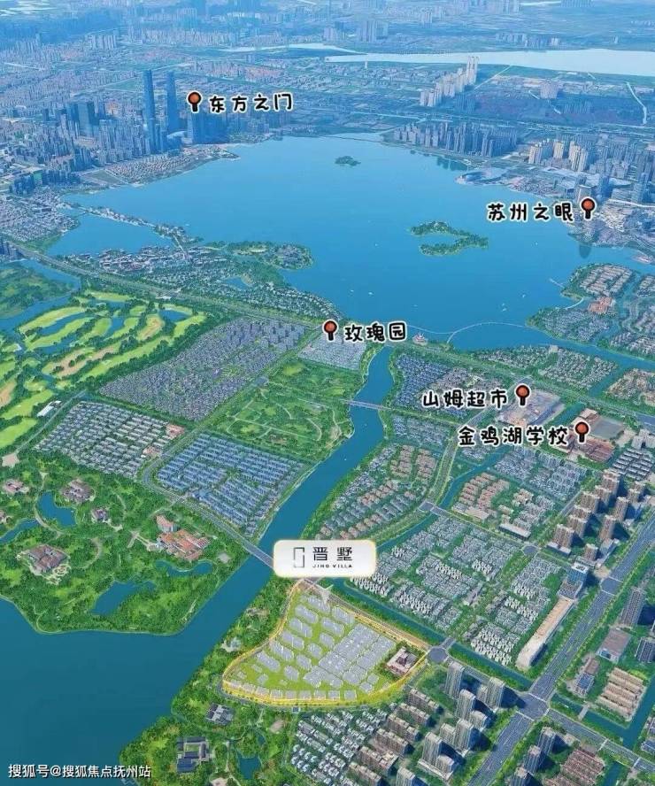 「晋墅」落子园区双湖正核——东延路南、西华林街东,直面独墅湖一线湖景,西眺金鸡湖大酒店,南侧为无遮挡绿地,堪称“双湖半岛秘境”。地块容积率仅1.02,是苏州近年罕见的低密宅地。