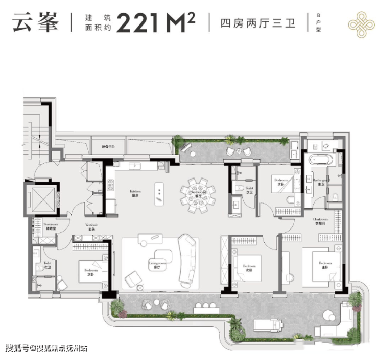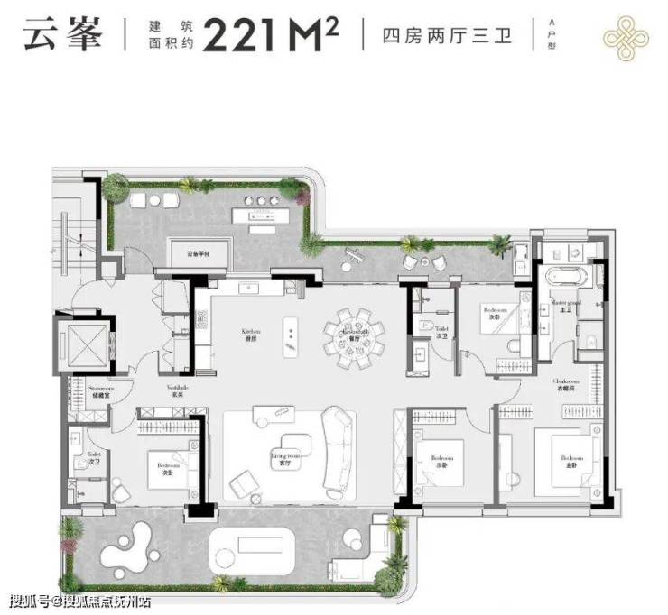以建面约221㎡四房两厅三卫户型为例,采用南向四开间,三间卧室朝南,其中两间为套房,主卧奢华配置,将繁华与静谧同时收纳于视野之内。