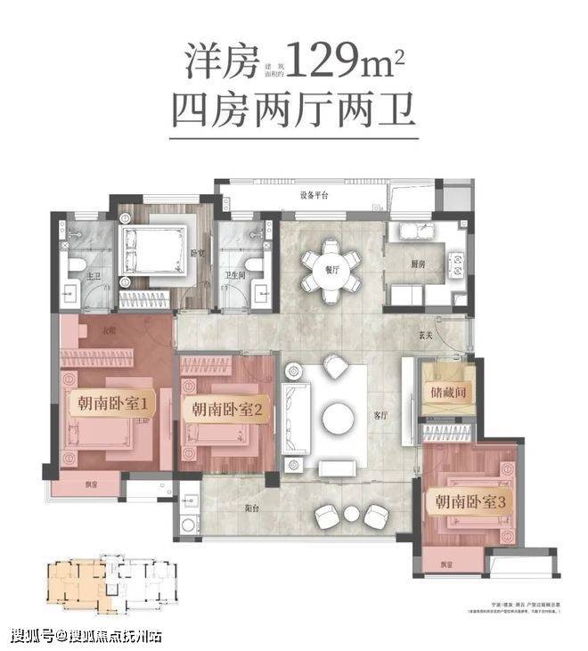 建筑面积约129㎡的户型,在洋房高得房率的基础上,更遵循了空间“零浪费”的要义——