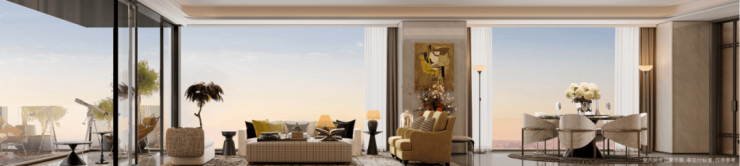 一梯一户的私密格局、3 米进深玄关的归家仪式,搭配近 11 米景观落地窗与超 60㎡滨江天际会客厅,构成 IMAX 环幕生活剧场,满足名流沙龙、家族聚会等多重仪式感场景。从双南向套房配置,到 5.1 米宽西南向观景阳台,再到隐形智慧收纳系统与柔性焕肤美学,空间在功能与尺度上实现巅峰平衡,让奢侈深藏于便捷与秩序,真正实现 “收藏世界,亦定义自我” 的居住哲学。