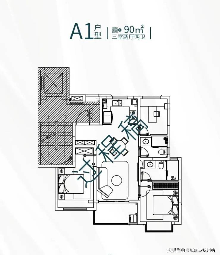 建面约90㎡的3室2厅2卫,一梯两户的设计,有着不低的得房率。