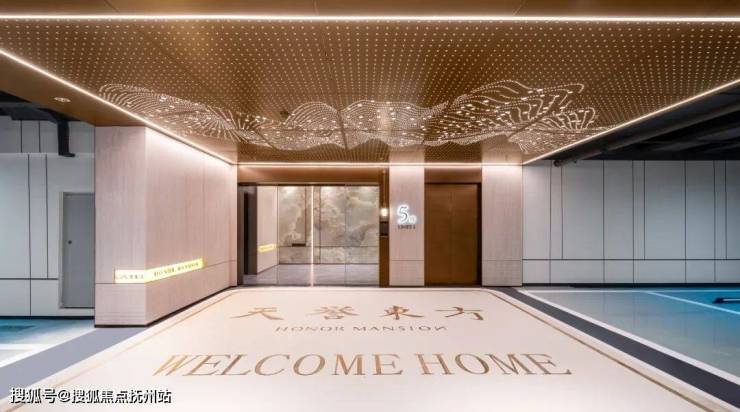 单元门甄选名贵石材搭配香槟金铝板,入户大堂精选翡翠绿岩板,顶部3D圆弧吊顶,一路星光温暖业主回家的路。