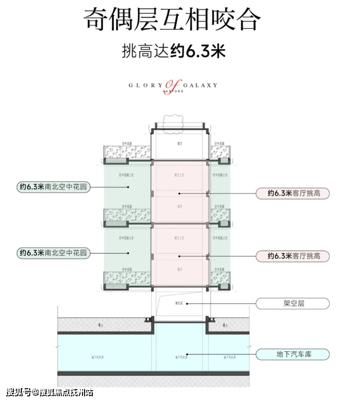 万濠东郡跃级四代宅,通过奇偶层错位互相咬合设计,让客厅及露台通高挑空,单层层高达到3.15米,客厅挑高达到6.3米!