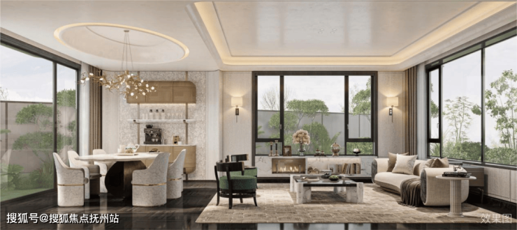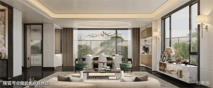 客餐厅、南向次卧、独立主卧层层配享同等尺度面宽,充分将全天日照最大限度地纳入室内。巨幅落地玻璃窗如同取景框,将庭院绿意无缝衔接入内,最大化确保了每位家庭成员都能平等地享有阳光与观景的权利。