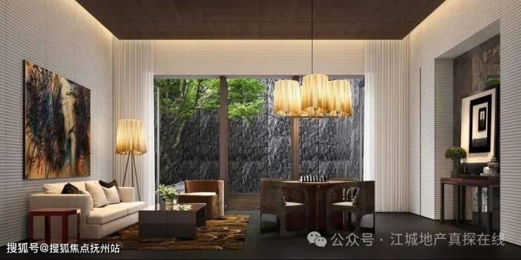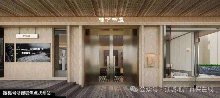 【心流盒子】:整个茶室空间由木材质进行包裹,天花木格栅造型延伸至墙面,打造出立于庭院旁的独特“木质盒子”。推开茶室折叠门,中心庭院的景观一览无余,示范区旖旎风光亦能尽收眼底。