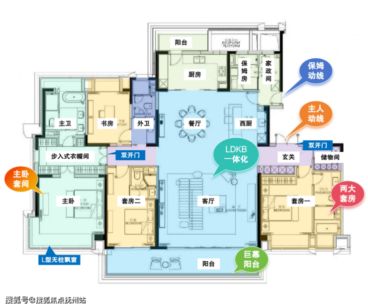 约7.35米大横厅不再是单纯的待客空间,而是聚合家庭成员日常的家庭核心区。南向双主卧套房设计,整体4个套房配置,层高约3.3米,保证了每个空间的尺度,平权式空间切割,让每一位家庭成员都是“主角”, 多代同堂的舒适需求得到极致满足。