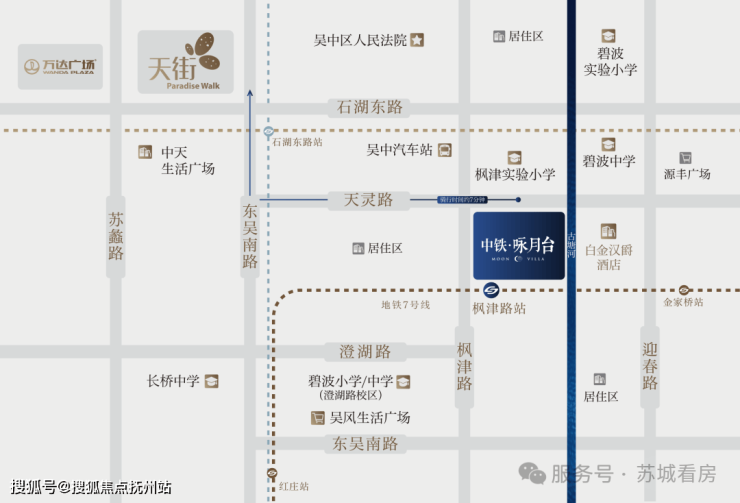 龙湖东吴天街、万达广场两大商业地标环伺,繁华举步即达;轨交2、4、7号线织就便捷路网,连接苏州各区;古塘河、石湖公园在侧,千年运河文化与现代城市文明于此交汇;枫津实验小学、碧波中学等优质学府环布,构建全龄段优教成长圈。