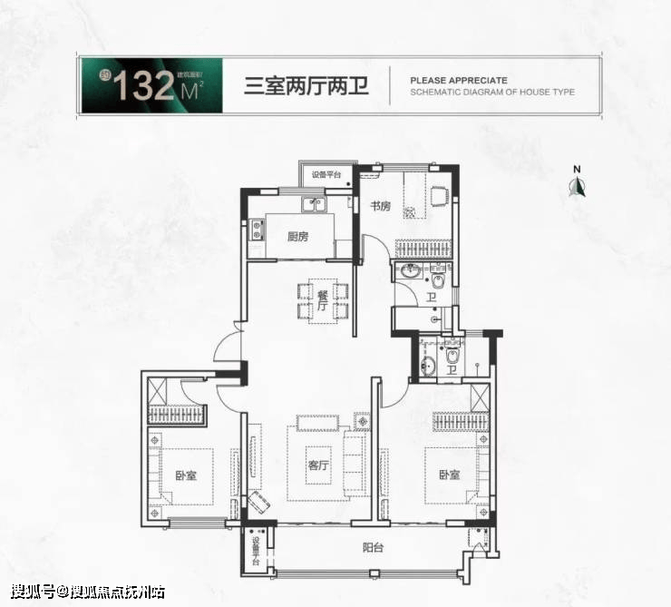 建面约 120 平方米的三室两厅两卫户型,南北通透,通风效果极佳。主卧采用套房设计,配备独立卫生间和衣帽间,为主人提供了私密、舒适的居住空间。客厅开间宽敞,连接着一个超大观景阳台,在这里可以俯瞰小区内的园林景观,享受惬意的闲暇时光。次卧与书房分布在户型的另一侧,动静分区明显,保证了休息和学习空间的安静。厨房与餐厅紧密相连,方便烹饪与用餐,且厨房配备了品牌厨具,提升了生活品质。