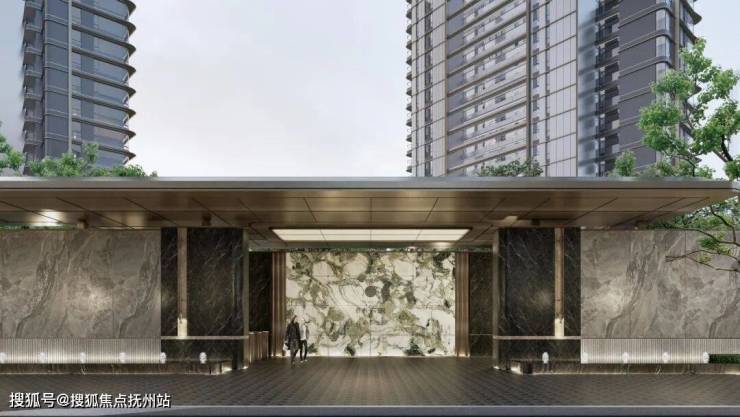 从远处看,对称的水景、海浪灰和雅士黑金大理石的对称景墙构成尊崇门庭,水景采用天然安哥拉黑奢石,再添一分典雅奢华的韵味。