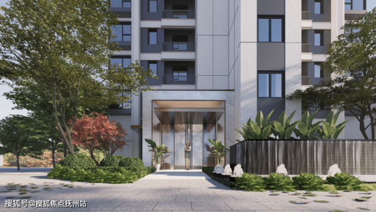 小区商业配套及入口大堂采用铝板和干挂石材设计,住宅单元入口也采用铝板及石材。住宅主体采用仿石涂料一体板,整个立面简洁现代,色彩温暖,时尚典雅。