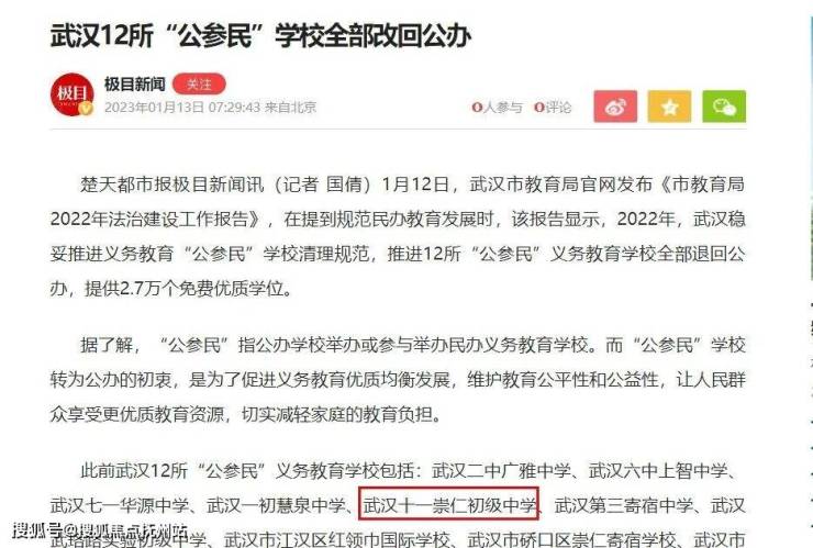 2024年7月武汉12所公参民学校改为公办,其中就有十一崇仁。