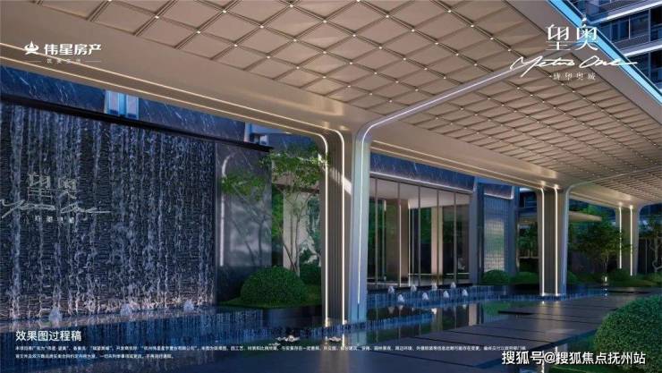 三面铝板立面,大面积玻璃运用,玻璃面连续长度大约9米;住宅顶部“悬浮云端”格栅塔冠设计,闪耀建筑的第五立面。约40米酒店式大门:以香港扎哈The Henderson为灵感来源,采用648块三角形宝石切割面打造矩阵高奢吊顶,规划高约5.6米,宽约40米的酒店式大门