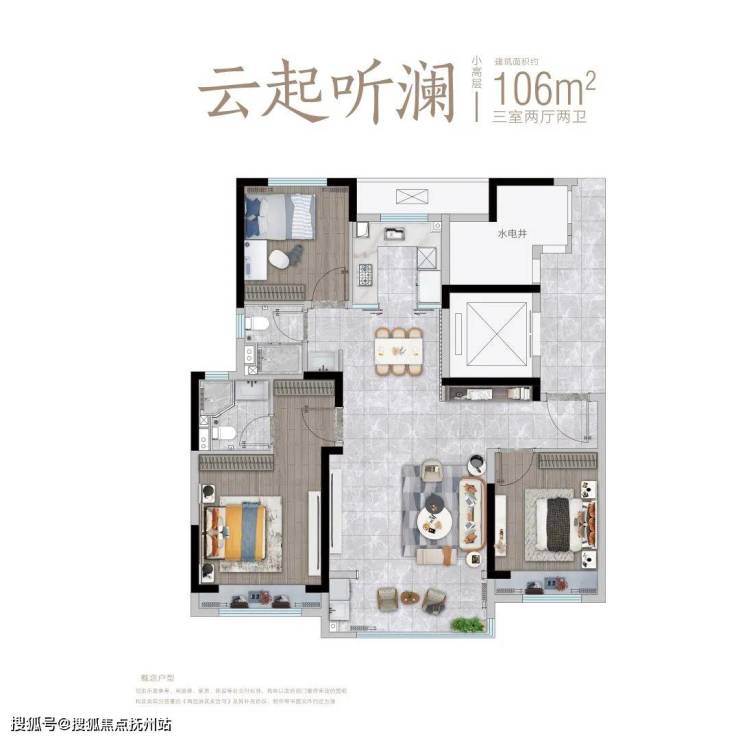 建面约106㎡户型,双卫生间,能满足两孩家庭、三代同堂的起居需求。约4.2m横厅,扩大了室内的采光面。