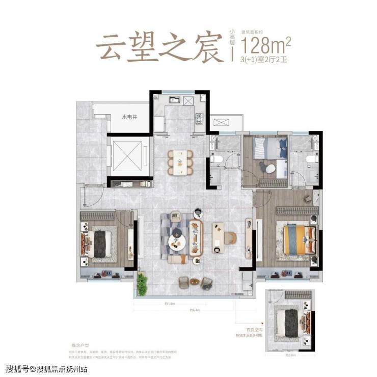 建面约128㎡的户型,约6.4米宽厅的景观阳台+落地窗设计,其中让业主享有约270°阔景视角,主卧带卫生间的设计,私密性也更强。