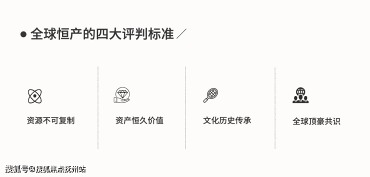 全球恒产的四大评判标准,资源不可复制、资产恒久价值、文化历史传承、全球顶豪共识。纽约上东区、巴黎左岸、香港太平山顶、上海外滩,都因为在全球超一线城市,毗邻中央公园、塞纳河、维多利亚港、黄浦江而成就不朽传奇。