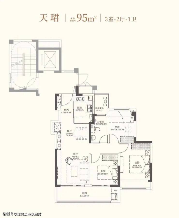建面约95㎡户型,以LDK一体化方厅与约6.3米南向双阳台的融合设计,打破隔阂,引景入室,在有限面积内创造出开阔的视觉与互动场景,满足年轻家庭的成长所需。