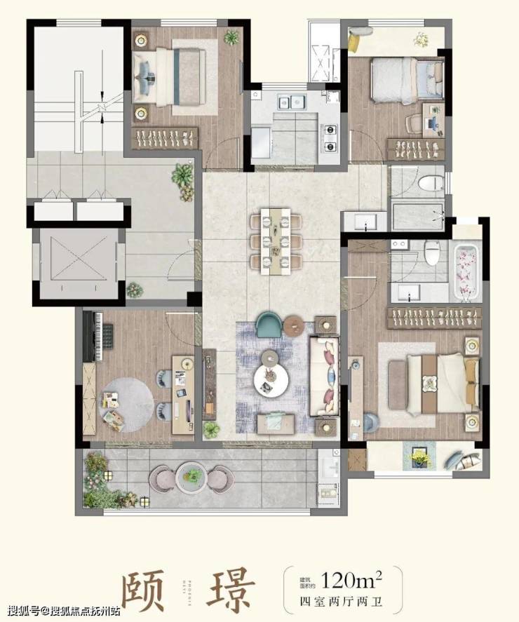 建面约120㎡洋房(四室两厅两卫):经典四叶草户型,三开间朝南双阳台,LDKG一体化设计,主卧大套房,可以随着家庭成员变化灵活调整,想象空间非常大。