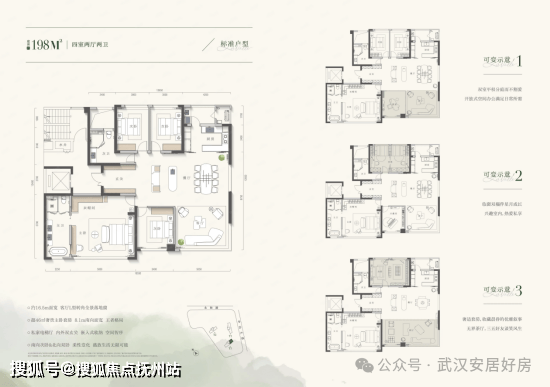 建面约198m²其核心价值在于颠覆传统的“灵活可变”设计。项目创新性地将南向的客厅与卧室、以及北向的两间卧室之间的非承重墙体设为可变动结构,从而演绎出至多四种不同的空间格局。这意味着,同一套住宅可根据家庭不同生命周期(如从二人世界到多代同堂)的需求进行“量身定制”,实现从满足多口之家的四房功能,到打造两人专属的奢阔大平层的自由转换。
