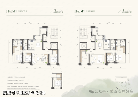 建面约146m²3室2厅2卫,两个镜面户型。整体为全明户型,南北通透,并实现四开间朝南,采光与通风性较好。户型格局方正,空间利用率高。独立电梯厅设计,增强了归家仪式感与过渡隐私。唯一可视为为舒适性所做的权衡,是连接三间卧室与卫生间的走廊空间,整体设计无硬伤。