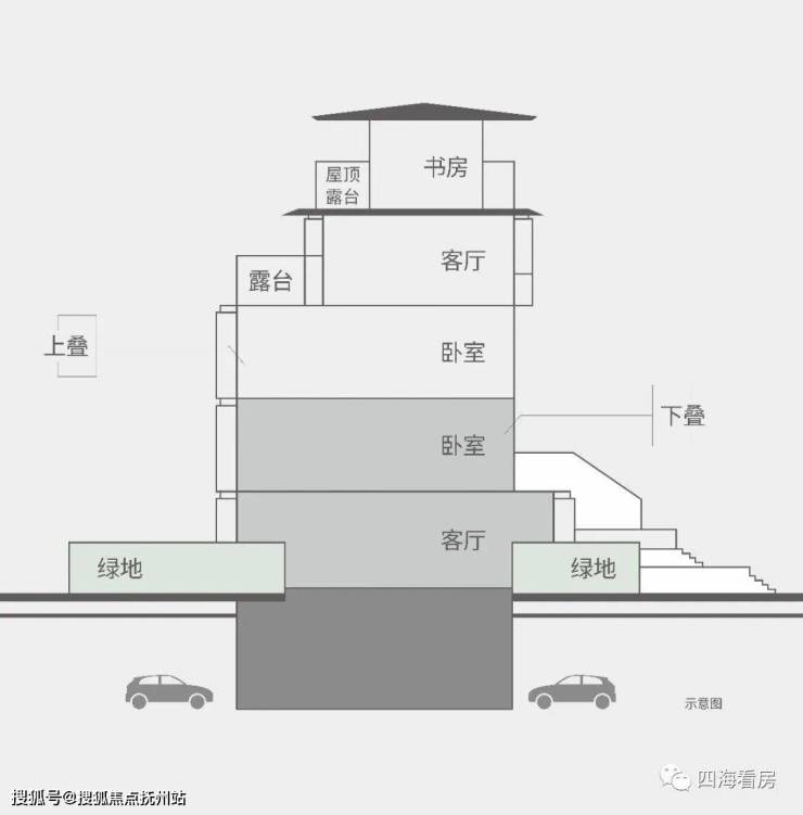 创新叠加组合,下叠二层与上叠三层可设置为卧室,“静区”相连,互不打扰,把与邻居之间的偶然尴尬化于无形。
