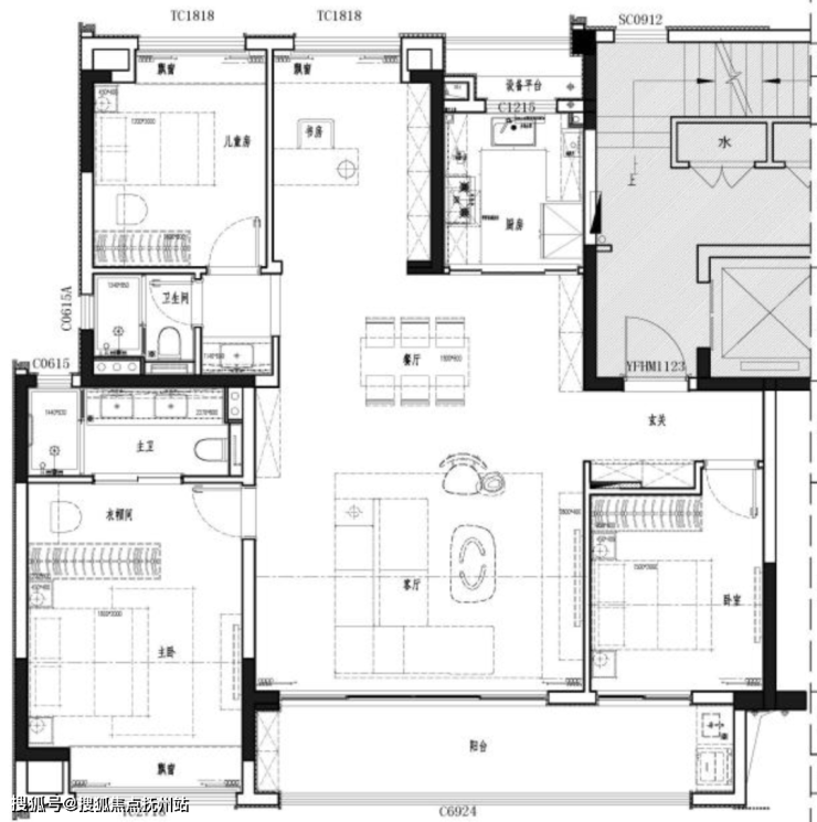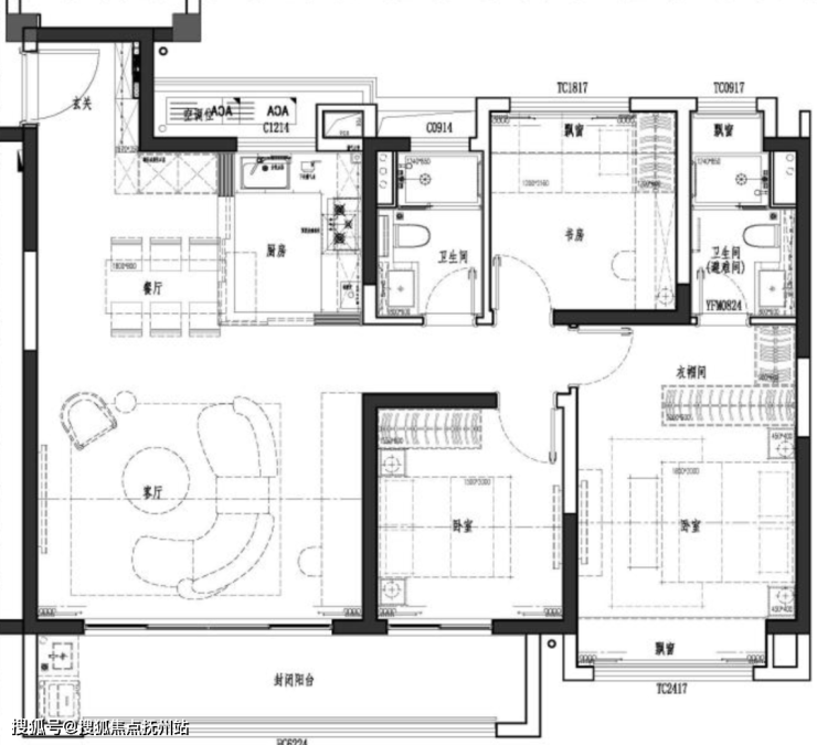 三室两厅两卫,3.5面宽奢侈宽厅动静分离设计,宽幕双跨阳台,主卧套房设计,搭配宽幕吊顶飘窗,L型科学操作动线,特色中岛。